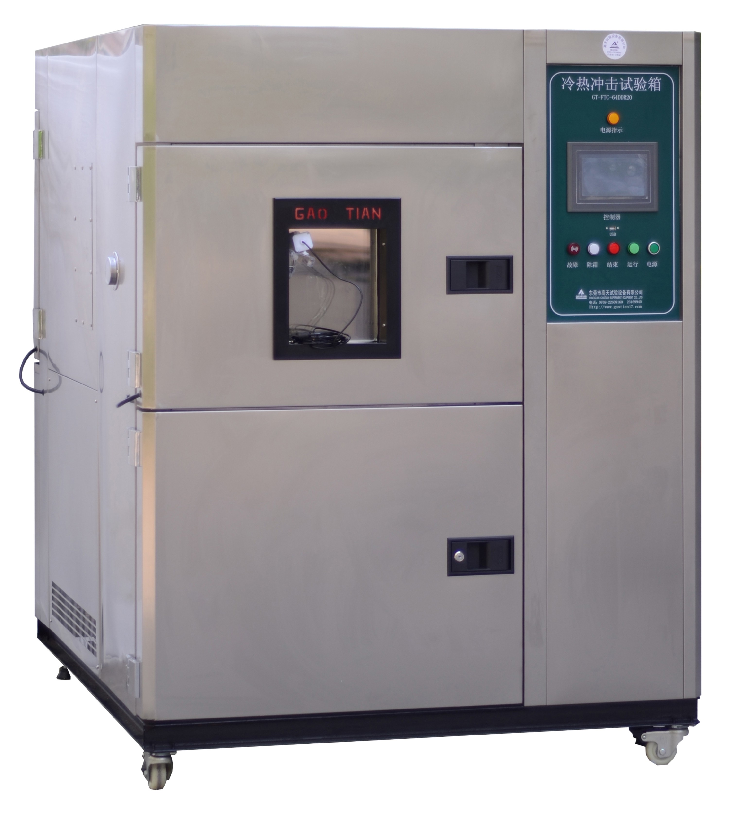 小型冷熱沖擊試驗箱 是利用低溫及高溫蓄冷熱槽,依動作打開閥門,將低溫及高溫通過送風系統快速快速送到試驗槽內,從而達到快速溫度沖擊效果,平衡調溫控制系統(BTC)+ 特殊設計之送風循環系統,以P.I.D.方式控制SSR,使系統之加熱量等于熱損耗量,故能長期穩定的使用.為了保證試驗箱降溫速率和zui低溫度的要求,本試驗箱采用一套進口法國?“泰康”全封閉壓縮機所組成的二元復疊式風冷制冷系統。復疊制冷系統包含一個高溫制冷循環和一個低溫制冷循環;觸控式瑩幕直接按鍵型控制器,中文表示7.5”的圖形之廣視角,高對比附可調背光功能之大型LCD液晶顯示控制器。